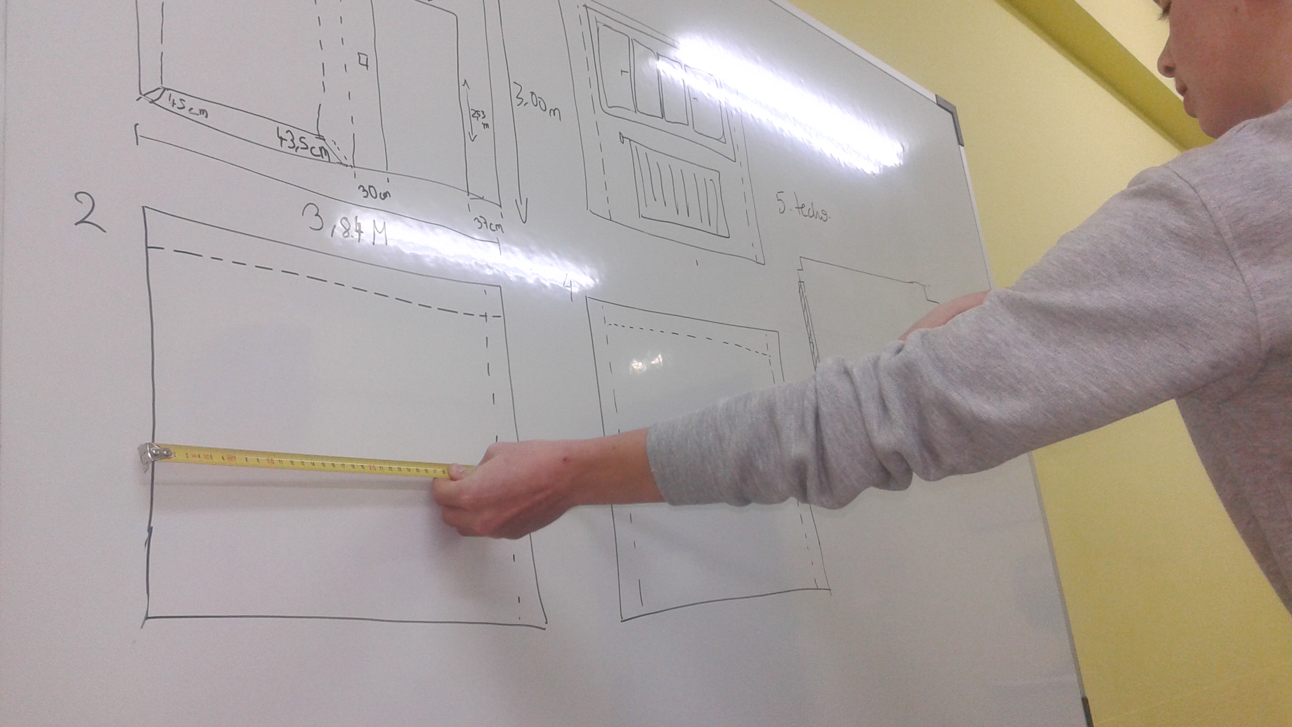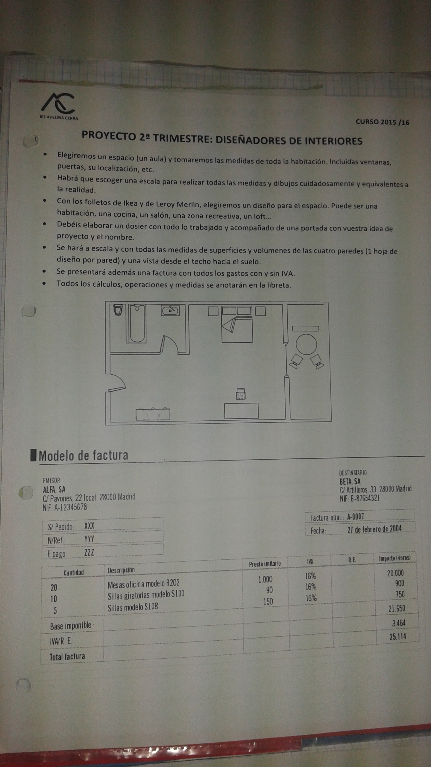 Hemos trabajado este trimestre en un proyecto sobre interiorismo. Hemos medido la clase, calculado superficies, dibujado bocetos a escala y calculado presupuestos con IVA.