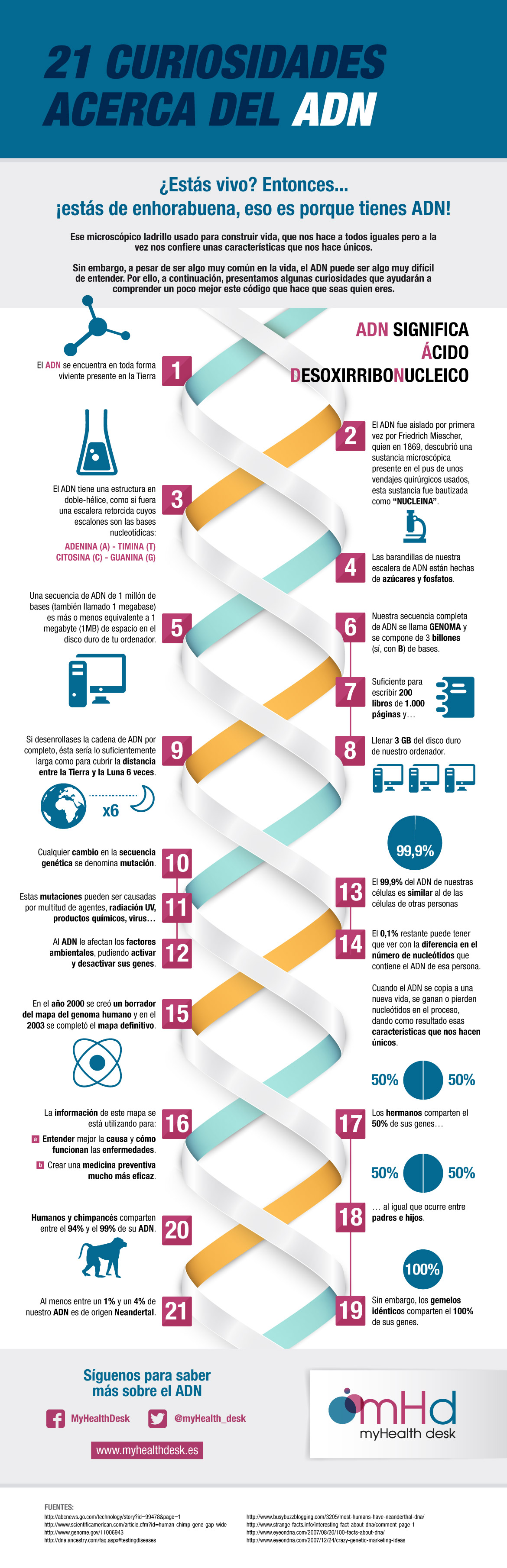 - En las curiosidades sobre el ADN descubrimos que, el Genoma Humano tiene cerca de unos 3500 millones de letras, esto quiere decir que si este fuera un libro y tuviéramos la capacidad de leer 10 letras por segundo, nos tardaríamos cerca de 11 años en leer el texto completamente.