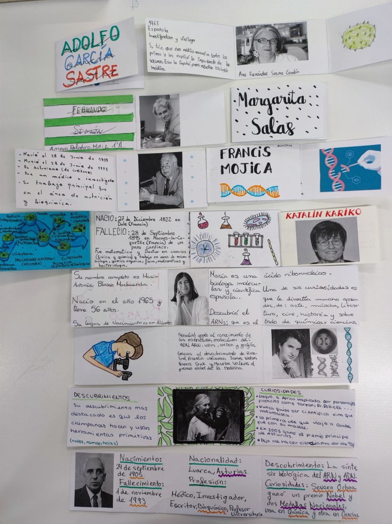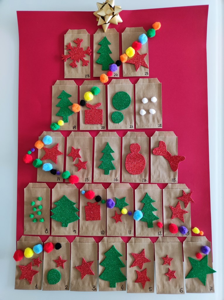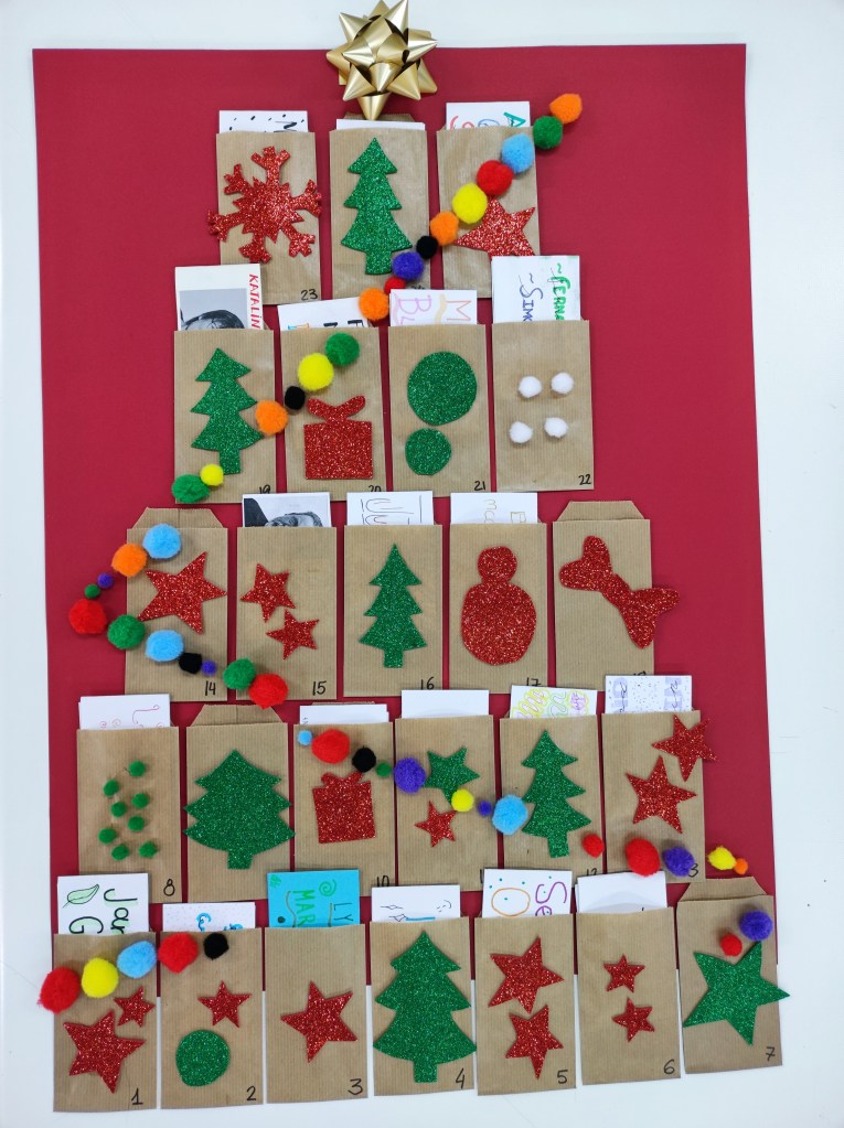 Elaboramos este calendario con 25 sobres Kraft (25 alumnos) y cartulina. Si se hace en fieltro puede ser reutilizable. Cada sobre puede ser decorado por un alumno/a. Dentro irá la información de un científico o científica. Lo ideal es que haya paridad y buscar tanto los de siempre como los más actuales. Cada día un alumno o alumna leerá para la clase su información y se ganará una chocolatina o similar.