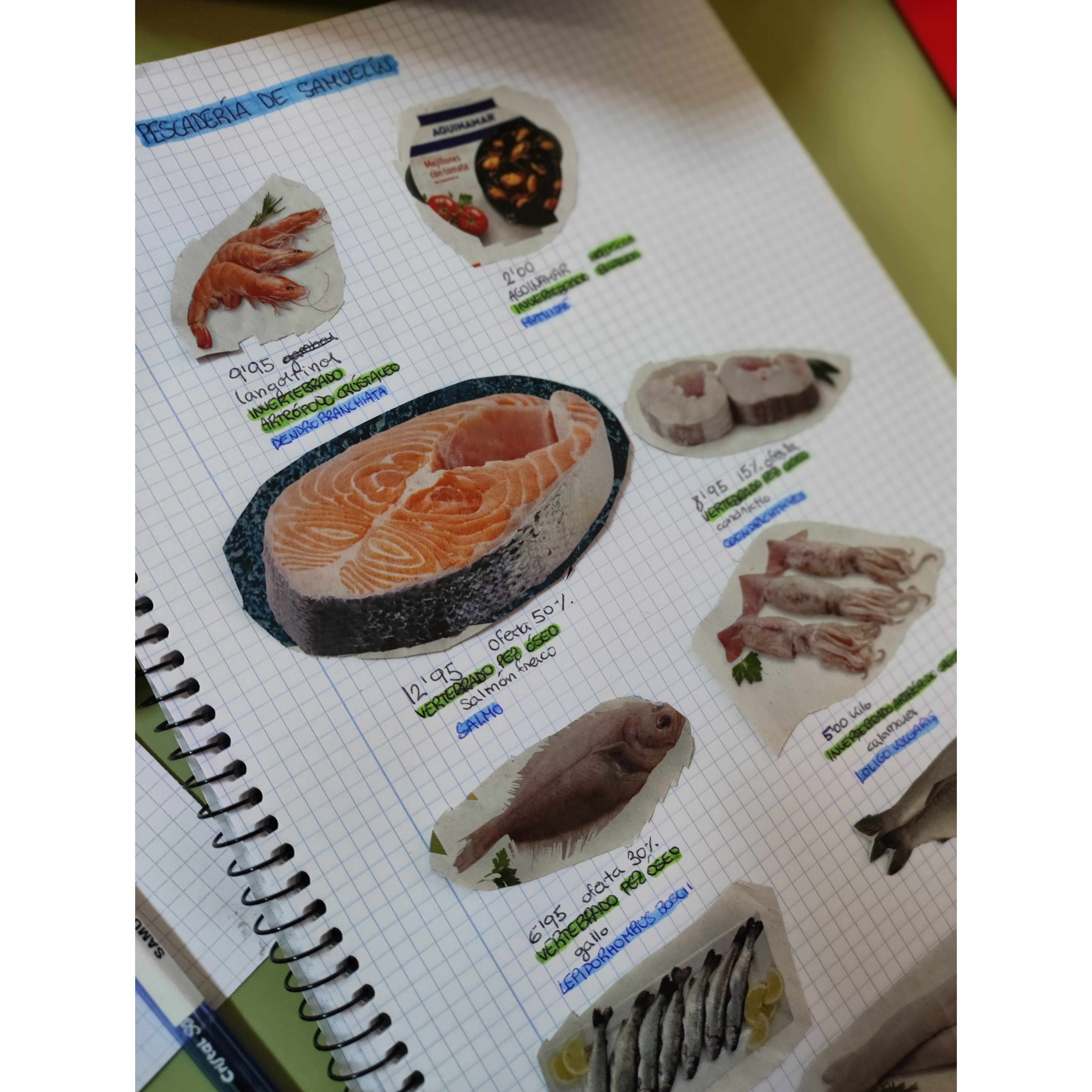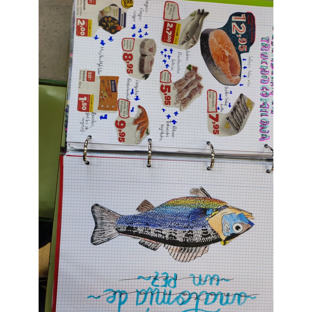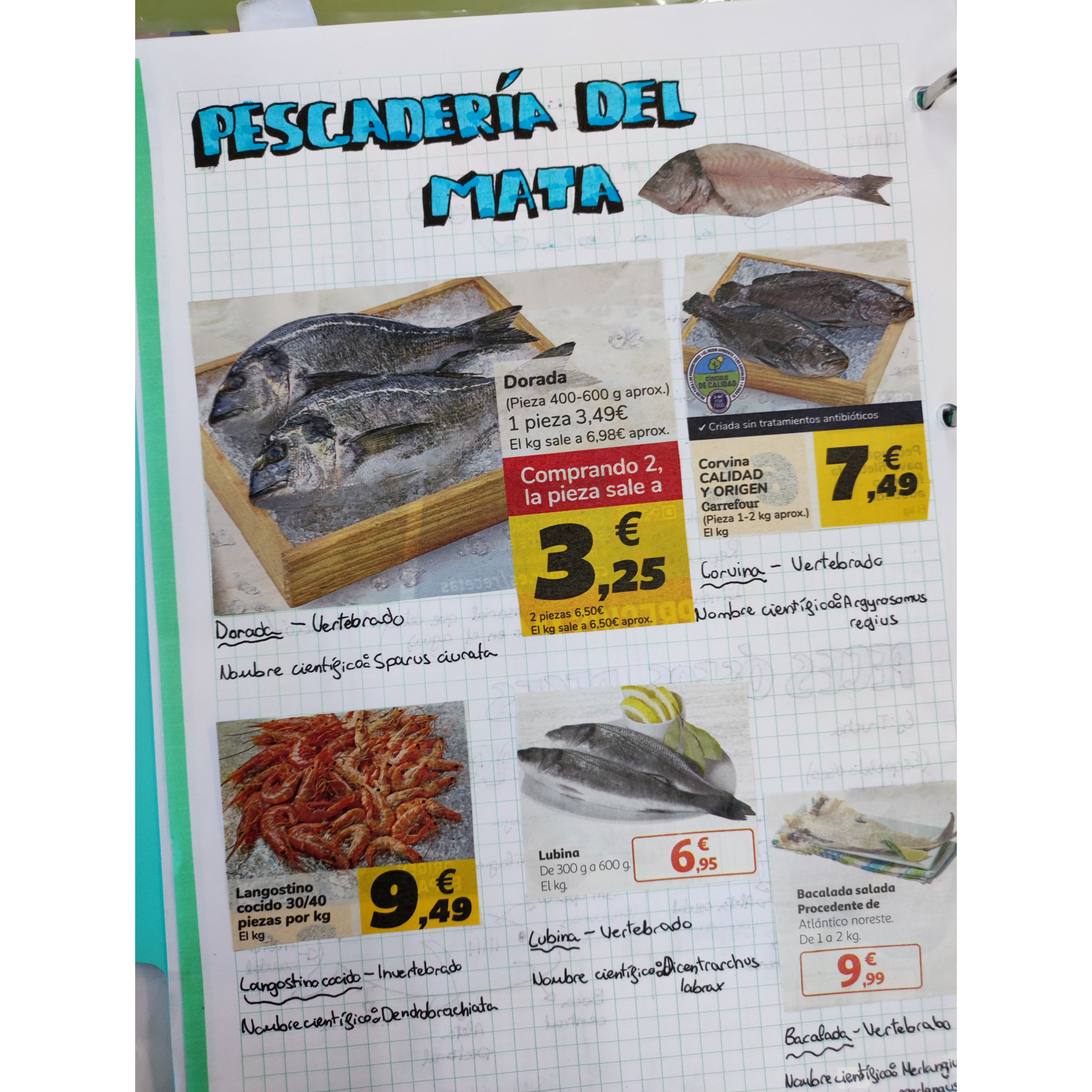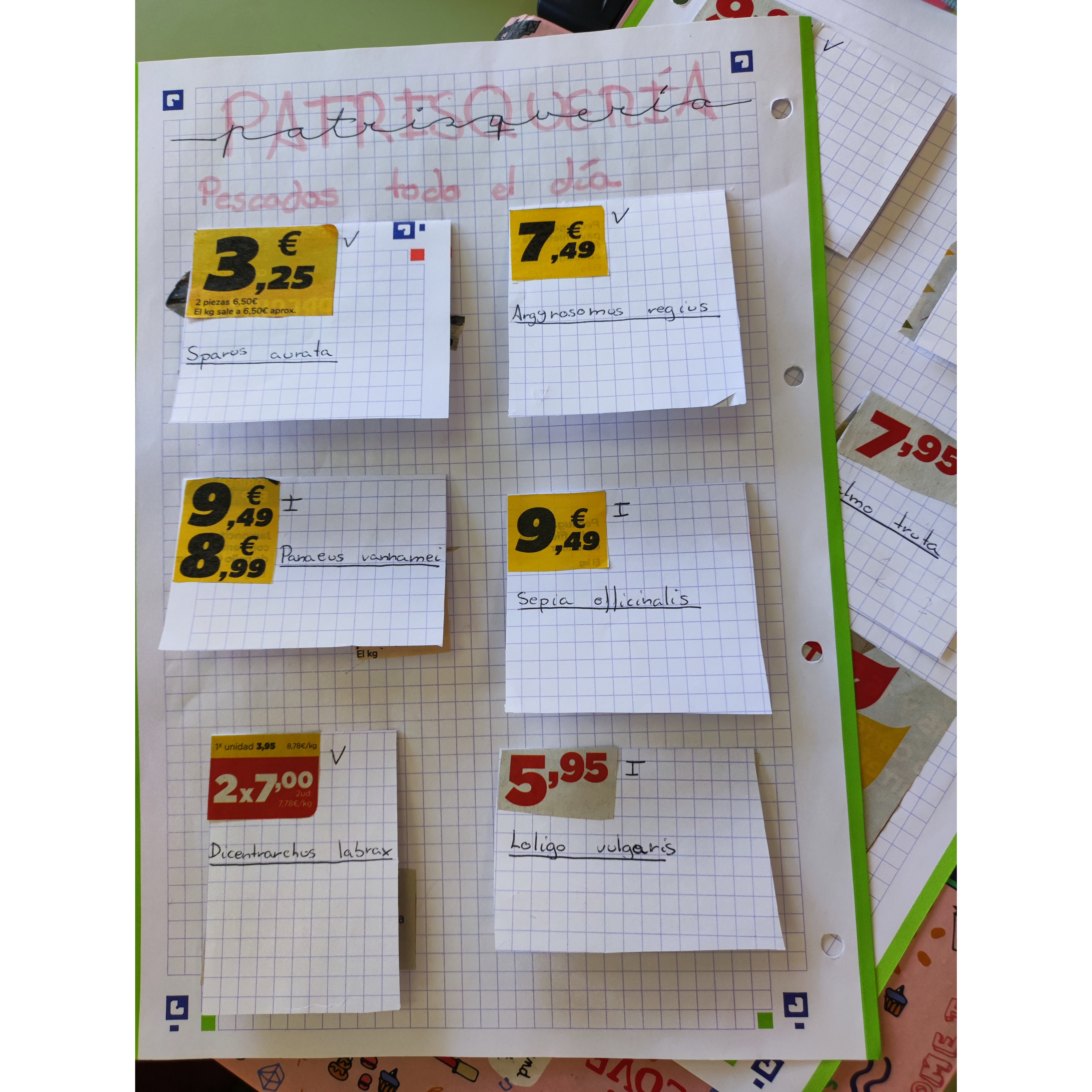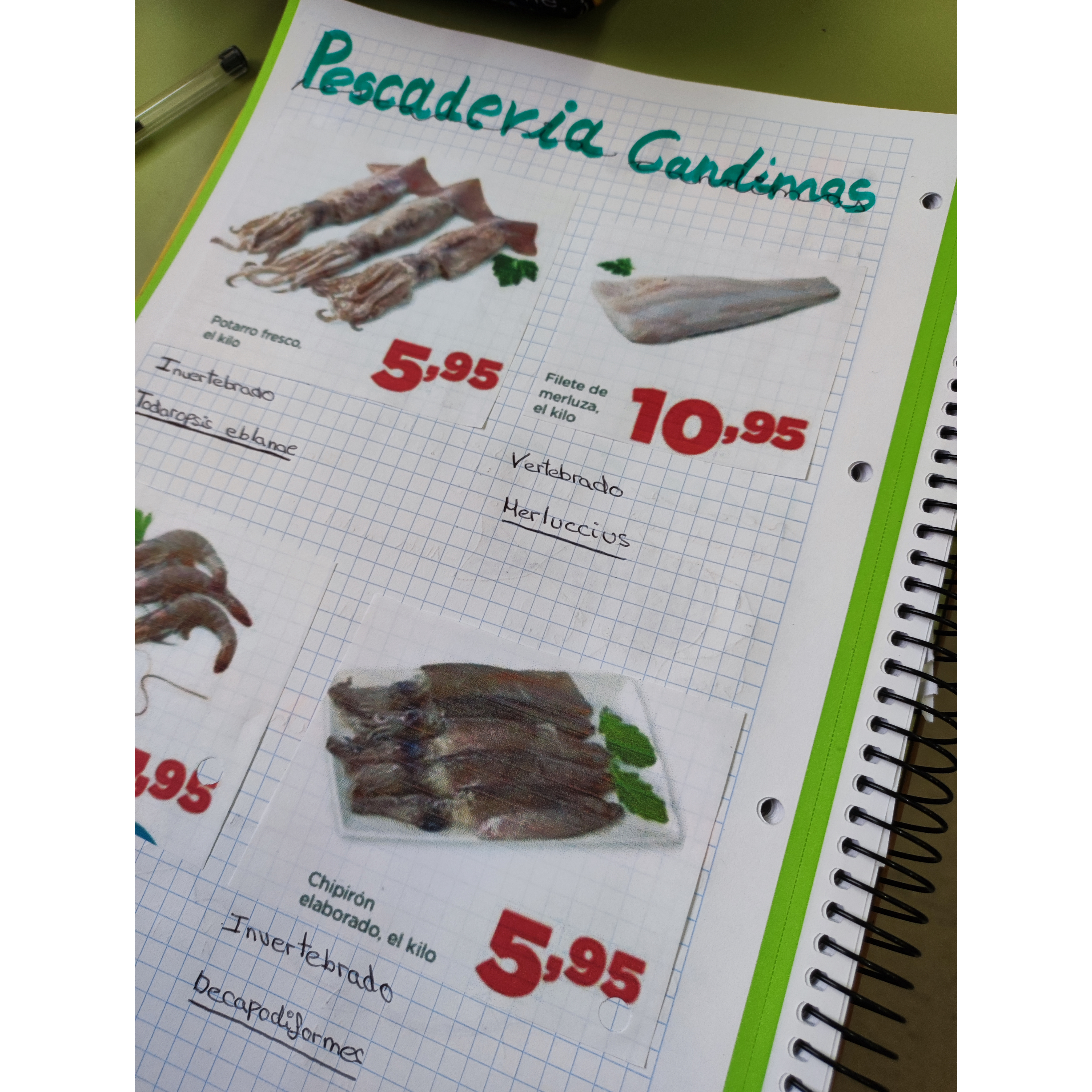 Esta semana, tras haber estudiado peces, hemos abierto nuestra propia pescadería. Hemos recortado la sección de pescadería de folletos de publicidad de distintos supermercados. Con ellos hemos clasificado en vertebrados e invertebrados los productos que vendemos y buscado el nombre científico de cada uno.