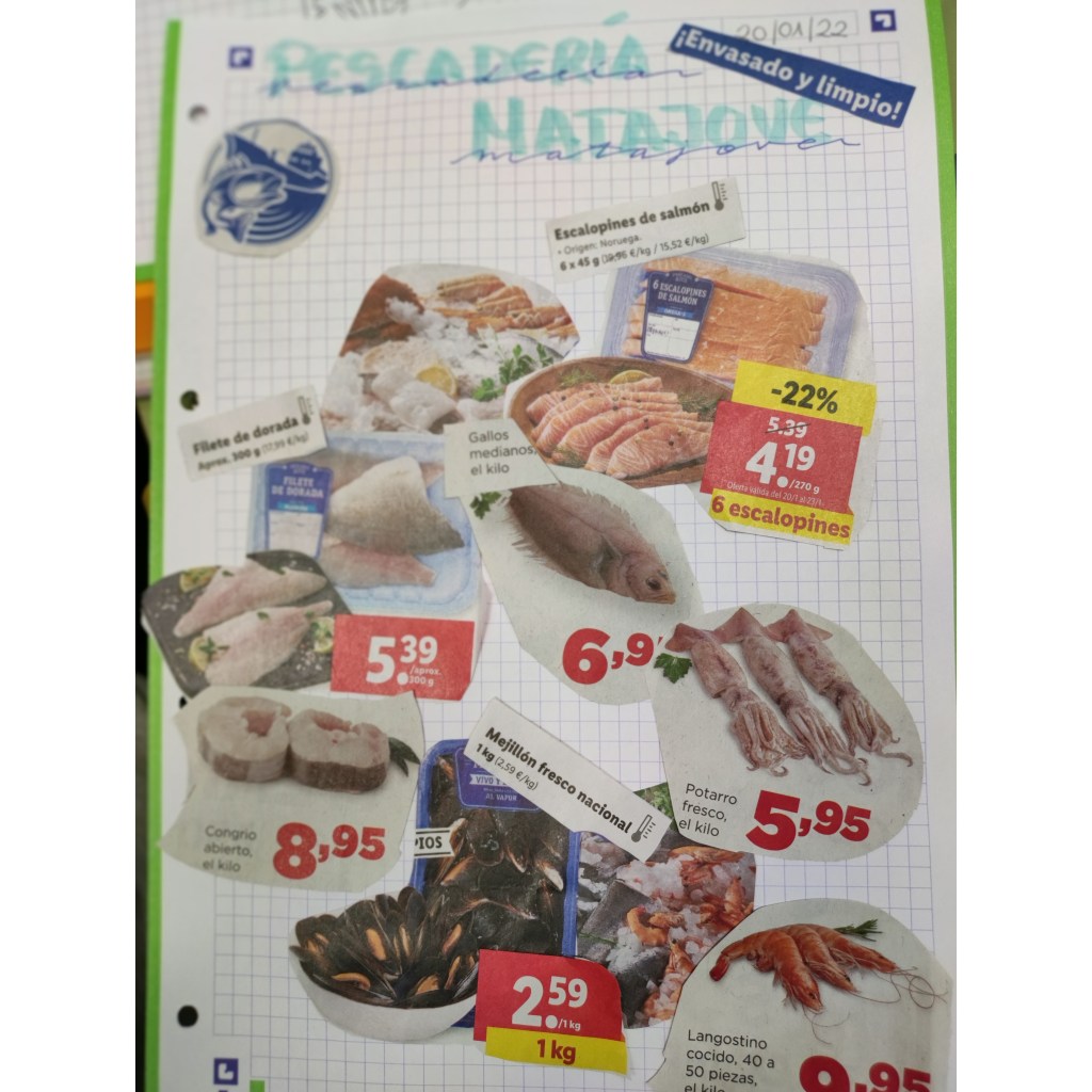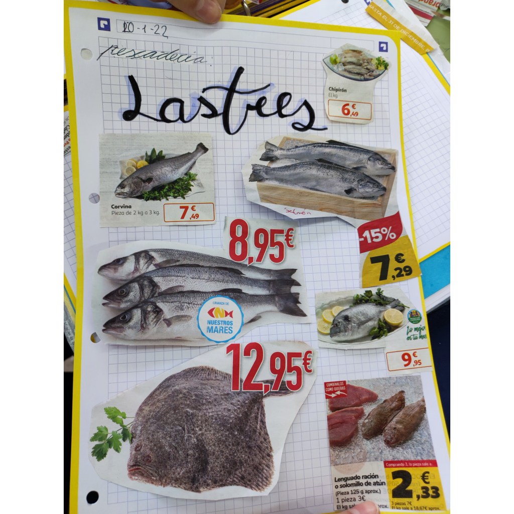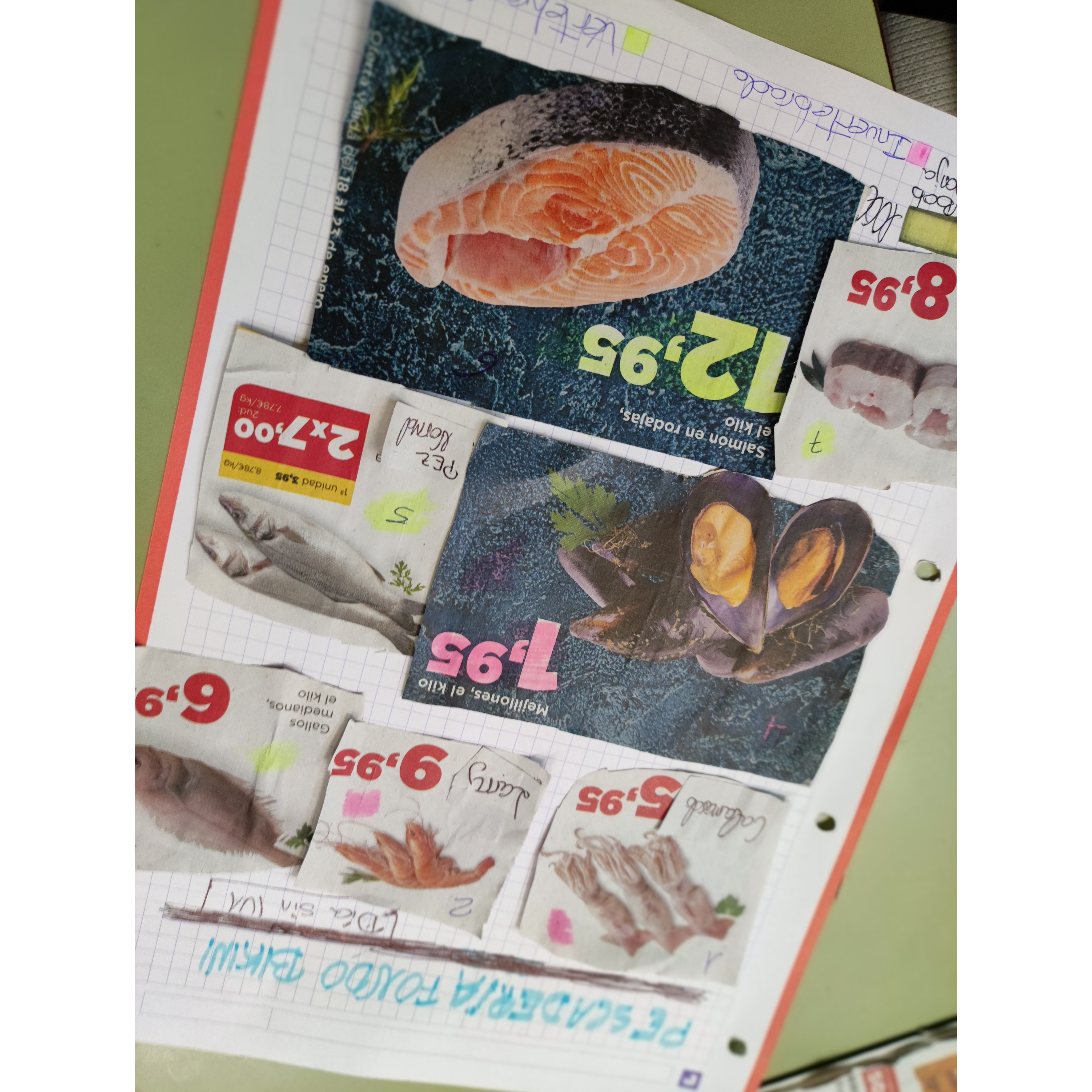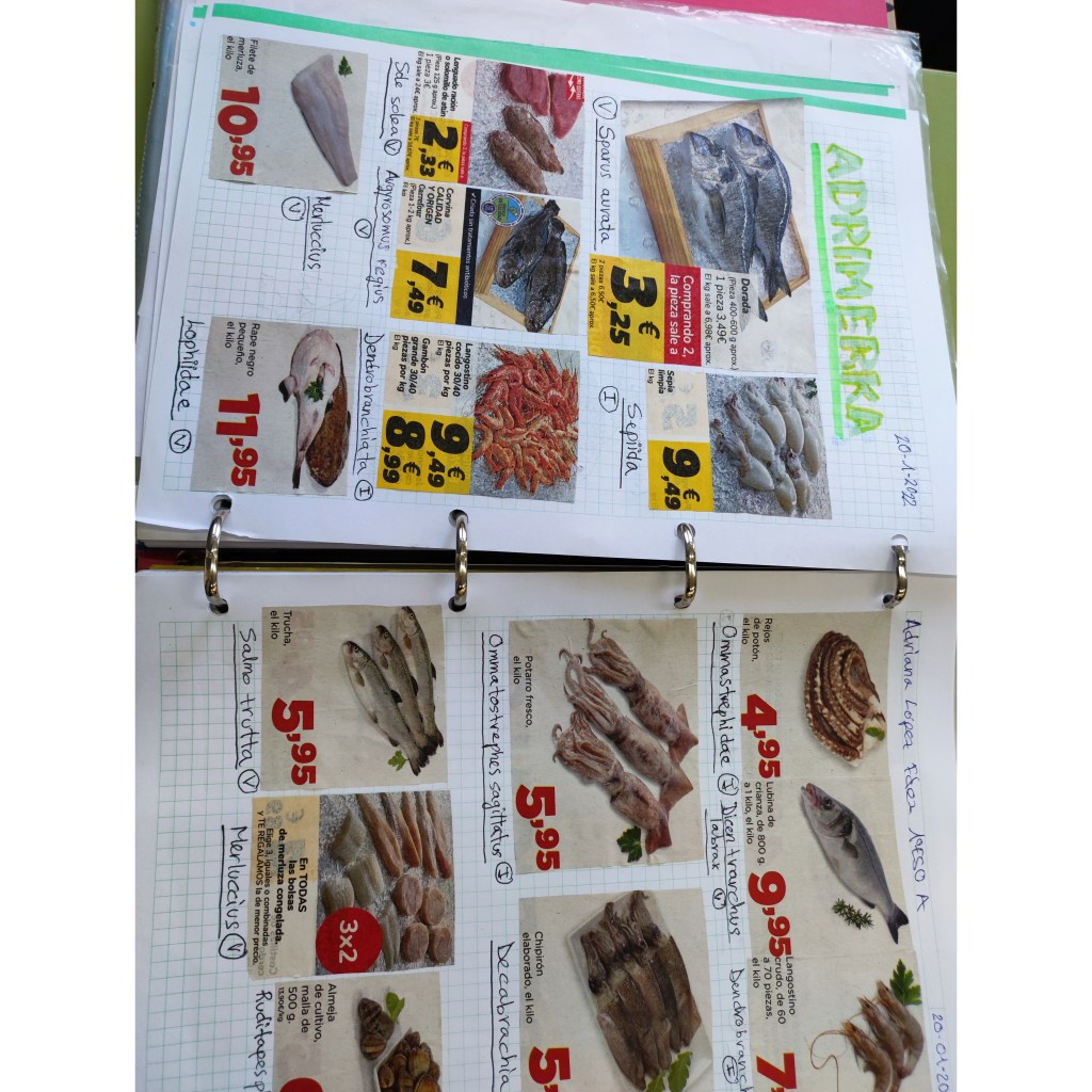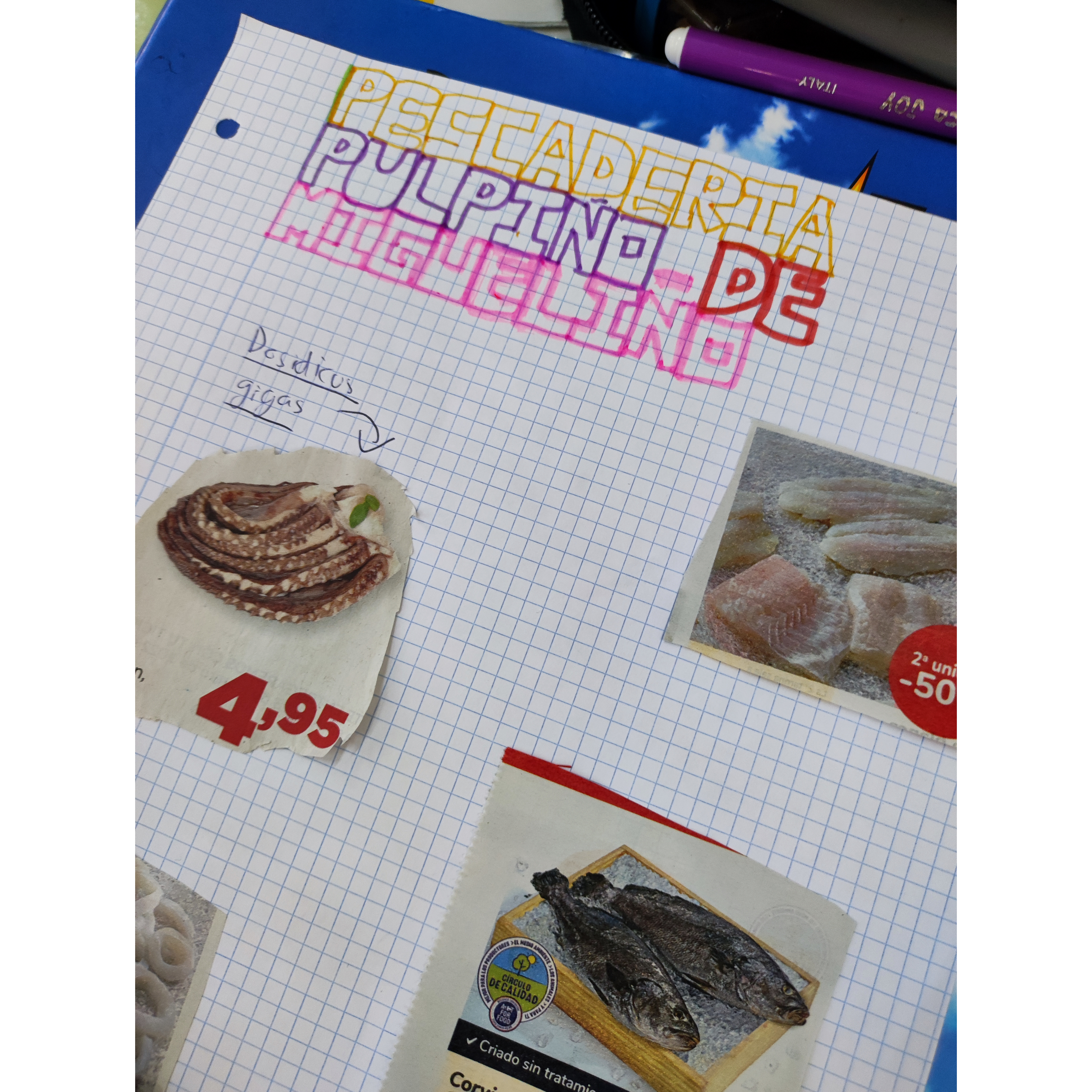 Esta semana, tras haber estudiado peces, hemos abierto nuestra propia pescadería. Hemos recortado la sección de pescadería de folletos de publicidad de distintos supermercados. Con ellos hemos clasificado en vertebrados e invertebrados los productos que vendemos y buscado el nombre científico de cada uno.
