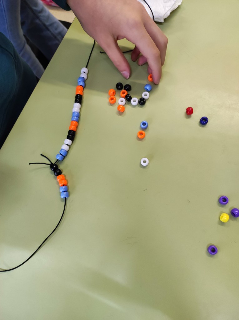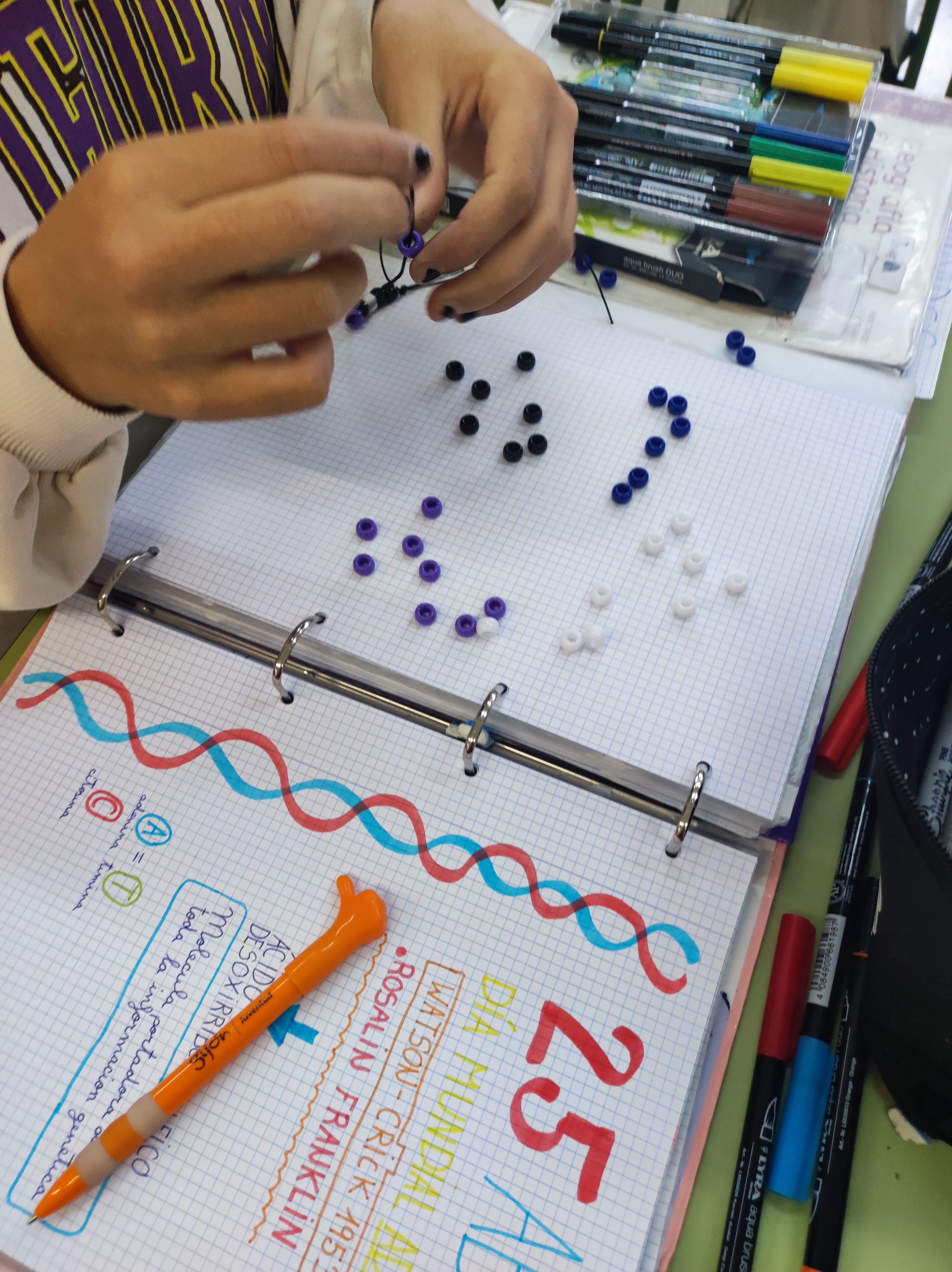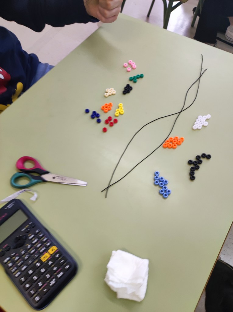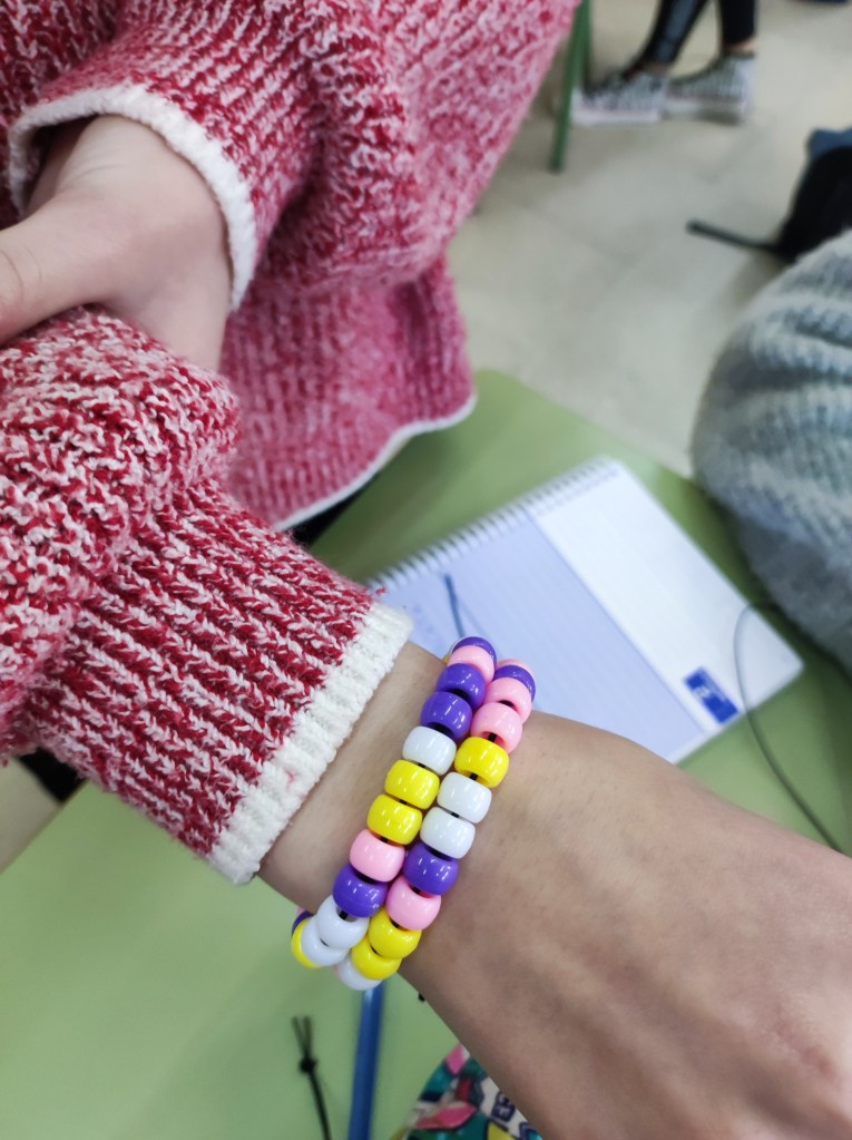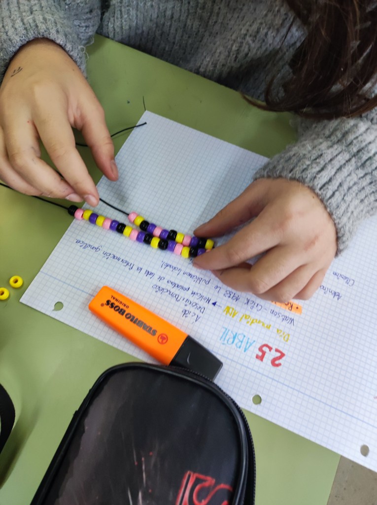 Para conmemorar este día, hemos hecho unas pulseras basándonos en el emparejamiento de bases del ADN. Cada alumno o alumna ha creado su propio gen para hacer su pulsera. Es una buena forma también de que empiecen a comprender el concepto de mutación.