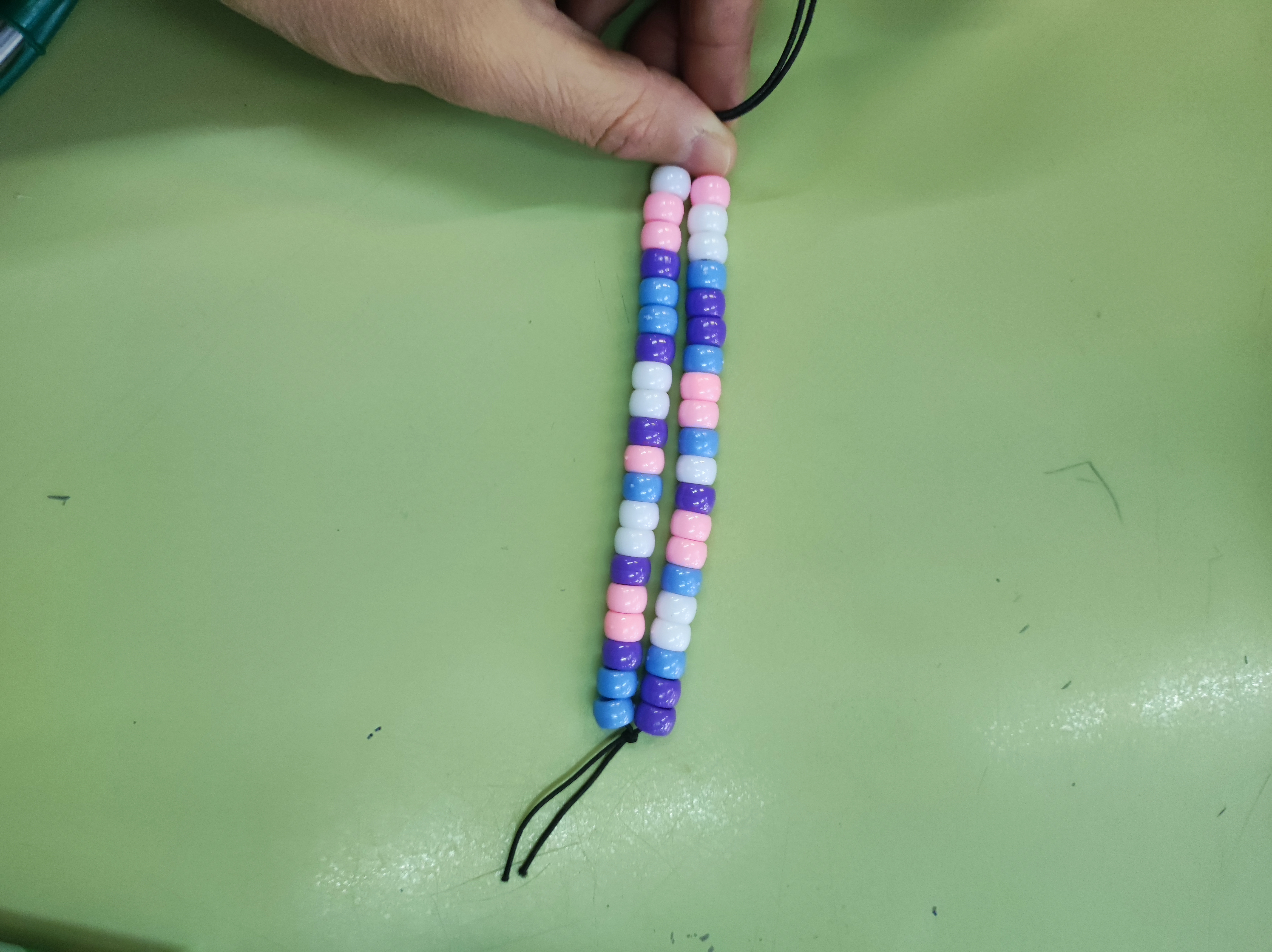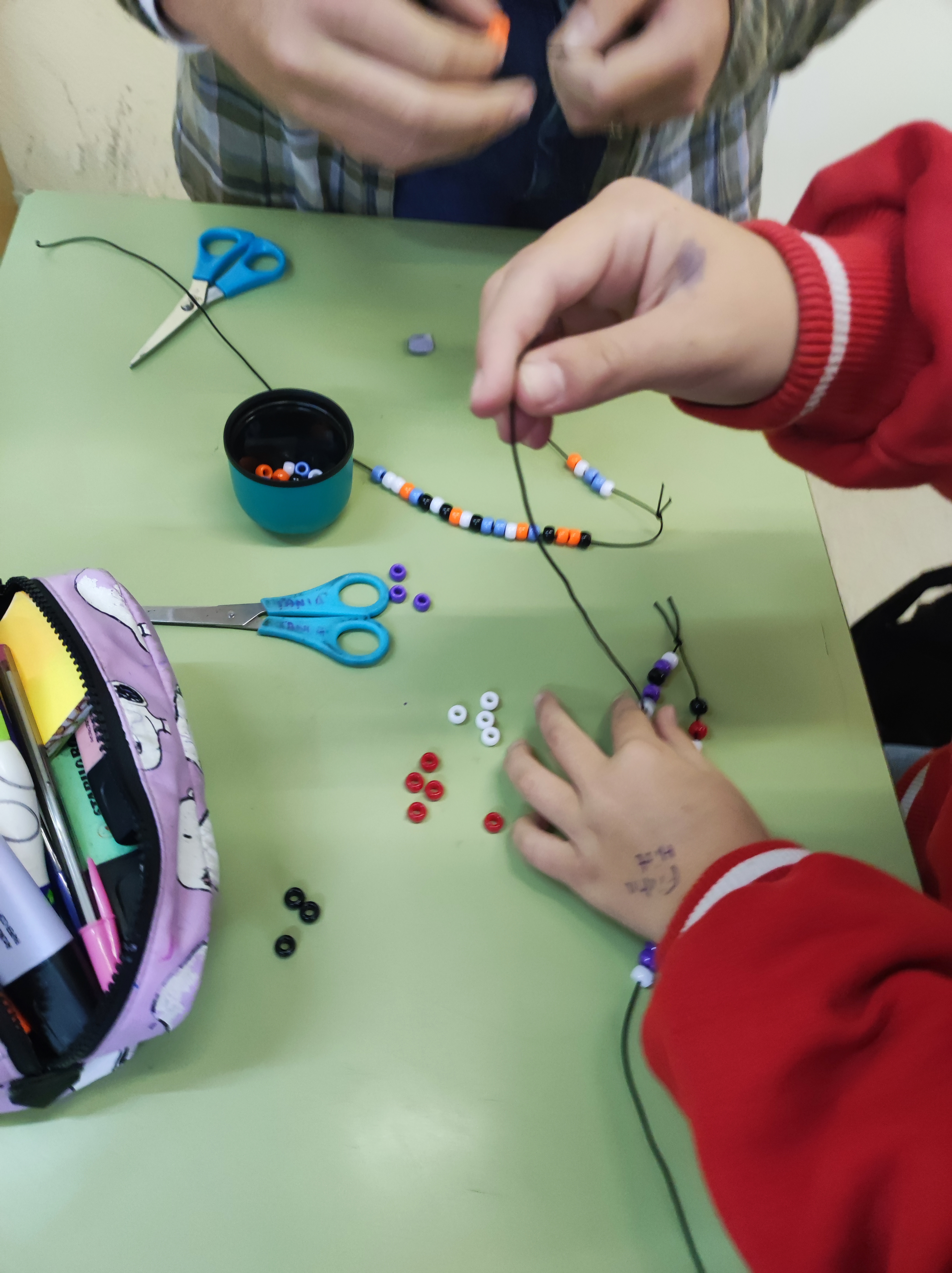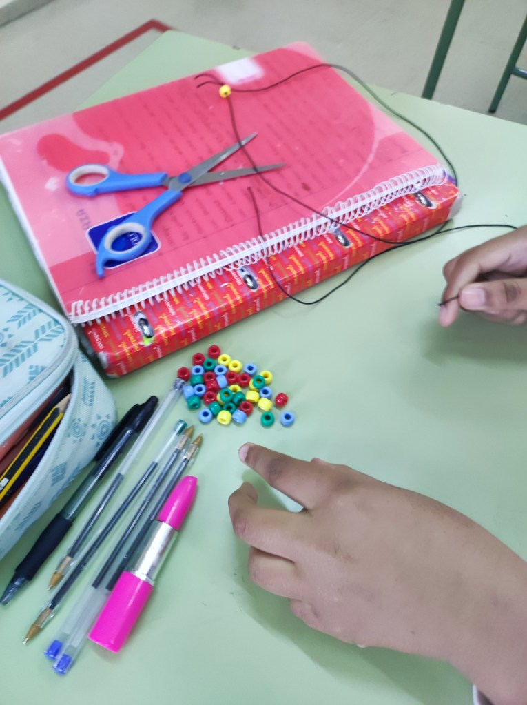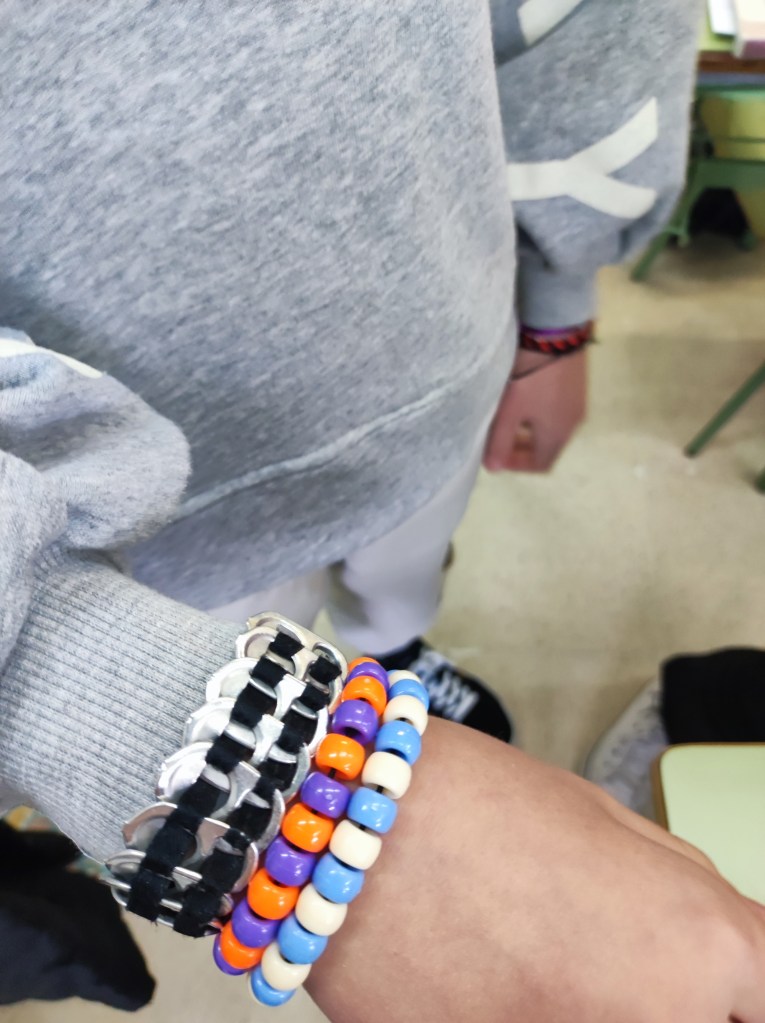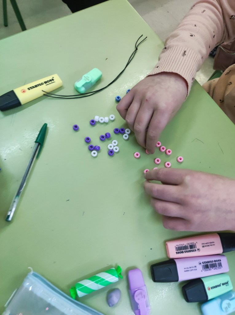 Para conmemorar este día, hemos hecho unas pulseras basándonos en el emparejamiento de bases del ADN. Cada alumno o alumna ha creado su propio gen para hacer su pulsera. Es una buena forma también de que empiecen a comprender el concepto de mutación.